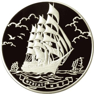 изображение плывущего фрегата «Мир», внизу на ленте – надпись «ФРЕГАТ «МИР», на втором плане слева и справа – два парусника, вверху – летящие птицы.