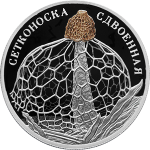 изображение сетконоски сдвоенной, ножка которой выполнена в рельефе, шляпка – в рельефе с нанесением цветной печати, сетка – в рельефе и в технологии лазерного матирования, и изображение травы, выполненное в рельефе; вверху вдоль канта – рельефная надпись: «СЕТКОНОСКА СДВОЕННАЯ».
