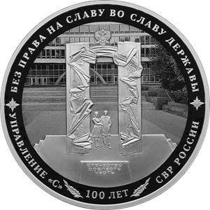 рельефное изображение скульптурной композиции в честь отечественных разведчиков «Отечество, доблесть, честь» на фоне изображения главного входа в штаб-квартиру Службы внешней разведки России; вдоль канта — рельефные надписи: «БЕЗ ПРАВА НА СЛАВУ ВО СЛАВУ ДЕРЖАВЫ», «УПРАВЛЕНИЕ «С», «100 ЛЕТ», «СВР РОССИИ», разделенные изображениями малой эмблемы нелегальной разведки и лавровой ветви.