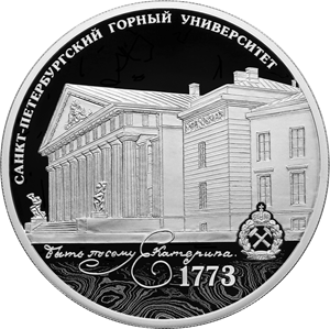 рельефное изображение главного корпуса Санкт-Петербургского горного университета; внизу, на фоне выполненного в технике лазерного матирования декоративного орнамента, напоминающего природный узор на срезах минералов, – выполненные рельефом цитата из указа Екатерины II о создании университета «Быть по сему Екатерина.», эмблема университета и дата его основания «1773»; слева вверху по окружности – рельефная надпись «САНКТ-ПЕТЕРБУРГСКИЙ ГОРНЫЙ УНИВЕРСИТЕТ».