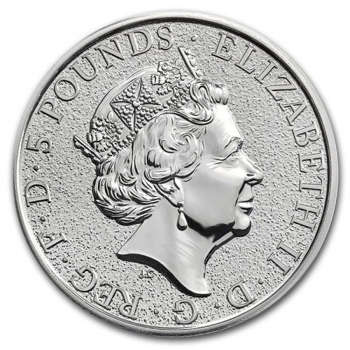 На аверсе серебряной инвестиционной монеты "Лев Англии" - портрет Ее Величества Королевы Елизаветы II, выполненный Джоди Кларком, представленный на британских монетах с 2015 года (так называемый пятый тип монетного портрета королевы). По краю монеты расположены надписи, указывающие на номинал монеты и имя Королевы: 5 POUNDS / ELIZABETH II / D / G / REG / F / D (5 фунтов стерлингов, Елизавета II, Божьей Милостью Королева - Защитница Веры).