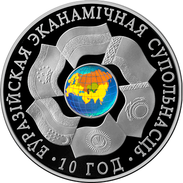 Реверс: в центре в обрамлении флагов стран, входящих в состав Евразийского экономического сообщества, – изображение земного шара, где на материке Евразия акцентно выделены границы стран - членов ЕврАзЭС, на серебряной - монете изображение земного шара выполнено голограммой; по кругу надпись: ЕЎРАЗІЙСКАЯ ЭКАНАМІЧНАЯ СУПОЛЬНАСЦЬ · 10 ГОД.