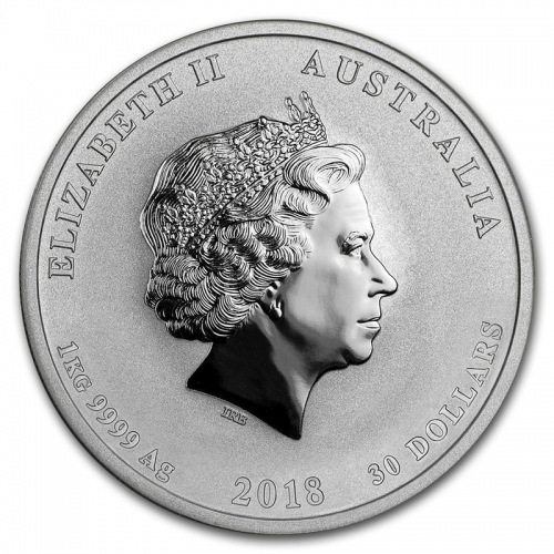 На аверсе изображен профиль королевы Елизаветы II. Сверху надписи: «ELIZABETH II» (Елизавета II) и «AUSTRALIA» (Австралия). Также внизу указаны вес (1 кг), проба (9999), название металла (Ag - серебро), год (2018) и номинал монеты – 30 австралийских долларов.