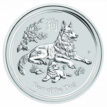 На реверсе изображен символ 2018 года – Собака, а именно немецкая овчарка и ее щенок, лежащие в траве на фоне китайских пионов. Сверху расположен китайский иероглиф, означающий "Собака". Внизу находится надпись: «Year of the Dog» (Год Собаки). Справа указан знак монетного двора – «P» (Пертский монетный двор).