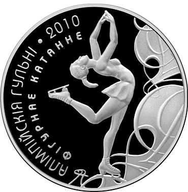 Реверс: в центре – изображение фигуристки на фоне стилизованного льда; слева по кругу надпись в две строки: АЛІМПІЙСКІЯ ГУЛЬНІ * 2010 ФІГУРНАЕ КАТАННЕ