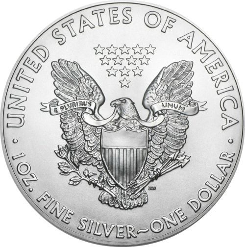 Реверс: на реверсе монеты изображен орел держащий в правой лапе ветвь оливы, в левой стрелы. Орел размещен за щитом, а над его головой расположены 13 звезд, символизирующих первые 13 колоний. По канту серебряной монеты Американский Орел расположены надписи "UNITED STATES OF AMERICA" и "1OZ. FINE SILVER~ONE DOLLAR". Дизайнер реверса Джон Мерканти.