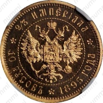 В правой лапе орёл держит скипетр, а в левой державу. Государственный Герб заключён в витую окружность. За окружностью, вдоль канта, текст:2/3 ИМПЕРIАЛА│10 РУСОВЪ│1895 ГОДАразделённая на три части тремя цветочными розетками. Буртик украшен зубцами.