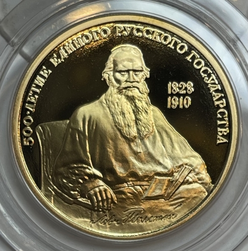 Слева, сверху и справа вдоль канта монеты слова «500-ЛЕТИЕ ЕДИНОГО РУССКОГО ГОСУДАРСТВА», в середине портрет Л.Н.Толстого, справа от него год рождения «1828» и под ним год смерти «1910», внизу вдоль канта надпись прописью «Лев Толстой».