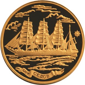 изображение плывущего барка «Седов», справа — символическое обозначение сторон света, внизу —надпись на ленте: «БАРК СЕДОВ».