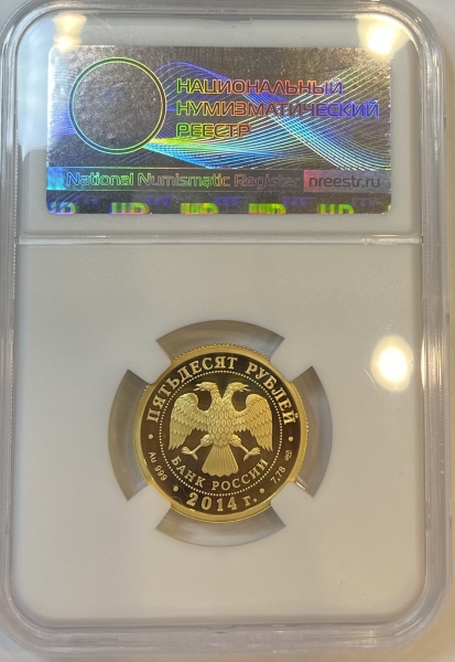 Золотая монета 50 рублей "БАМ" в слабе ННР PROOF 70 , 2014 г.