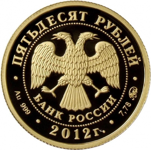 в центре диска - эмблема Банка России (двуглавый орел с опущенными крыльями, под ним - надпись полукругом "БАНК РОССИИ"), обрамленная кругом из точек и надписями по кругу - вверху: "ПЯТЬДЕСЯТ РУБЛЕЙ", внизу: слева - обозначения драгоценного металла и пробы сплава, в центре - год выпуска "2012 г.", справа - содержание химически чистого металла и товарный знак монетного двора.