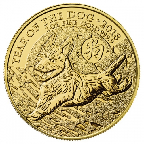 На реверсе изображен терьер, китайский иероглиф, обозначающий собаку и надпись вверху по ободу в две строки – «YEAR OF THE DOG 2018 1OZ FINE GOLD 999.9» (Год Собаки 2018, содержание чистого золота и проба – 1 унция чистого золота, проба 0,9999).